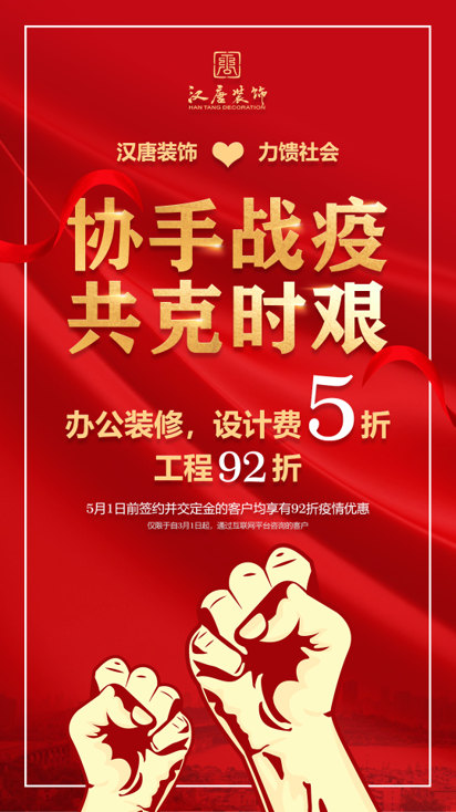 作为一家肩负社会责任的企业,我们时刻谨记着奉献社会的精神。面对这场灾难性的疫情,我们集公司之力为各位创业者提供专业帮助,疫情期间,我们破历史的推出办公装修“设计费5折,工程92折”,帮助企业渡过难关,为这场疫情战斗贡献绵薄之力。