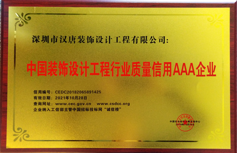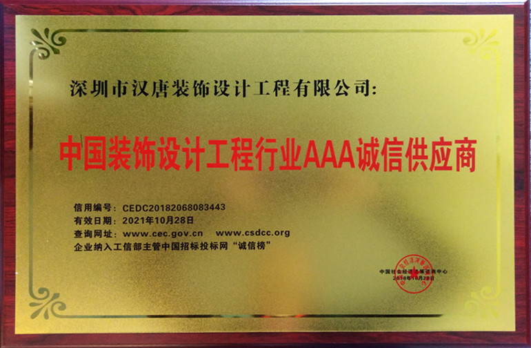 2018年10月28日,中国社会经济决策咨询中心对深圳市立博·官方(中国)的信用状况进行了评价,结果为AAA级,颁发了“中国装饰设计工程行业AAA诚信供应商”“中国装饰设计工程行业质量信用AAA企业”证书,同时汉唐建设被纳入工信部主管中国招标投标网“诚信榜”。