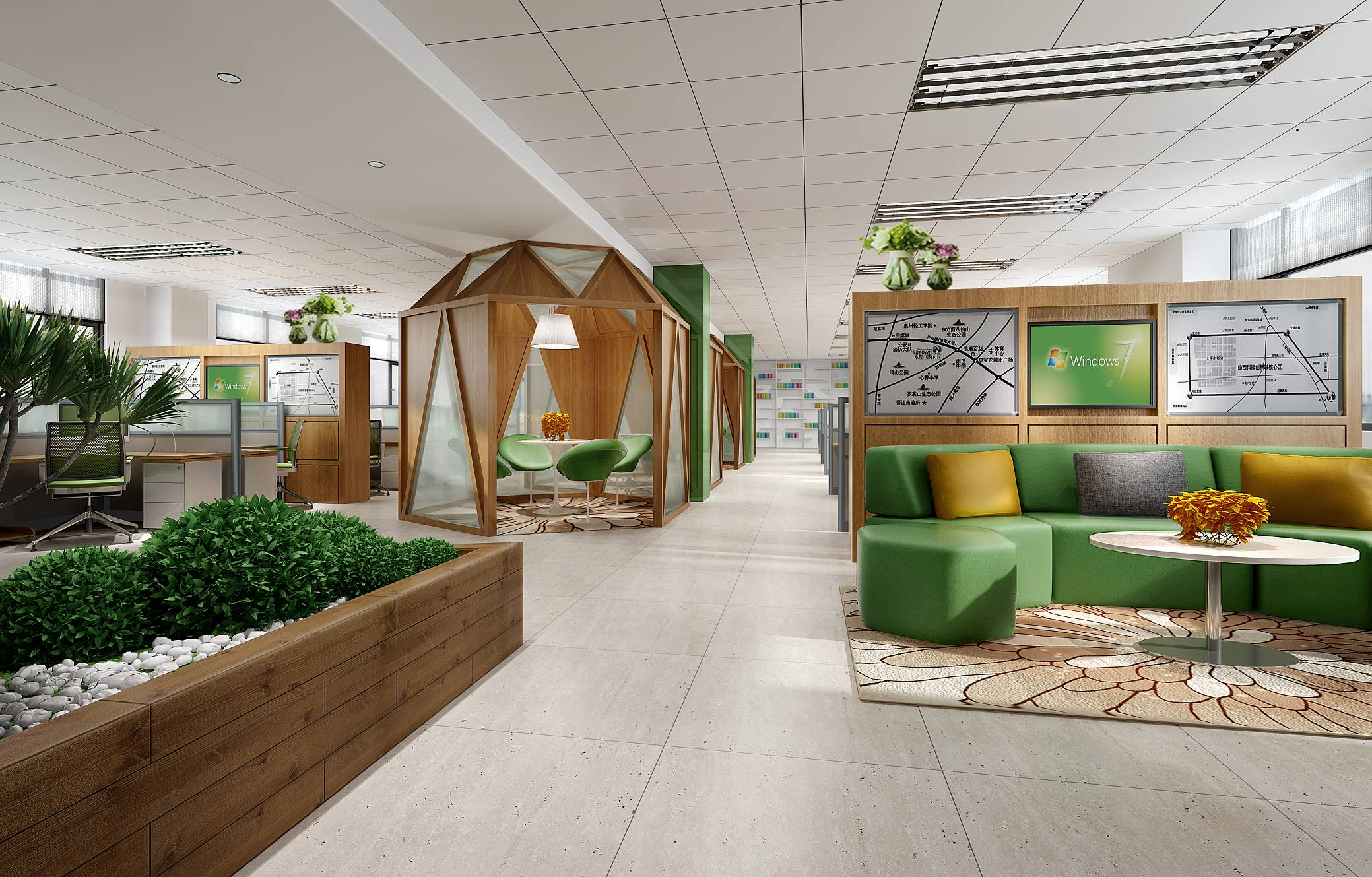 办公室设计公司可以为客户提供绿化建设服务,如种植低矮灌木、草坪、花坛等,营造出一个自然、优雅、宜人的办公环境。