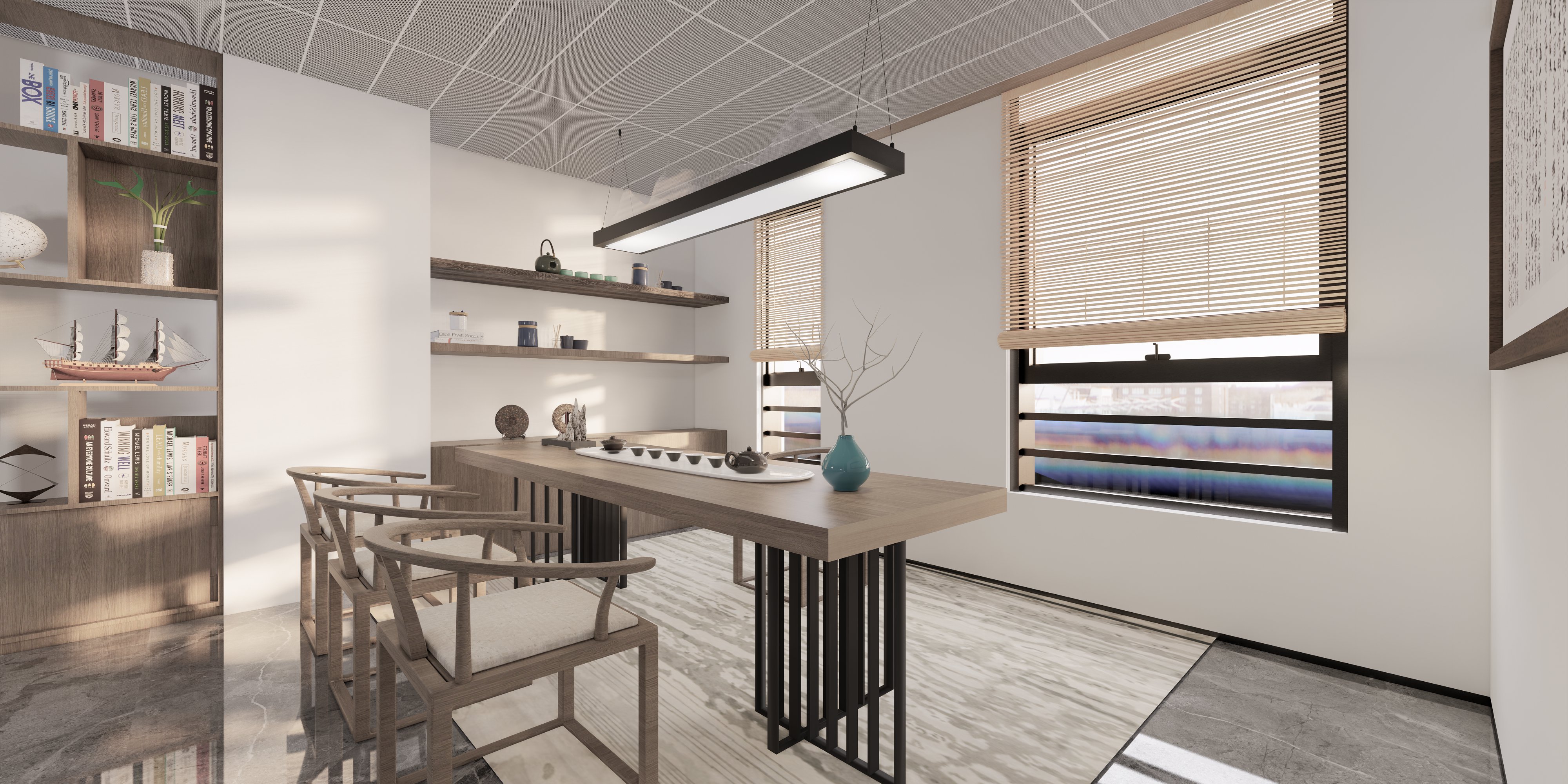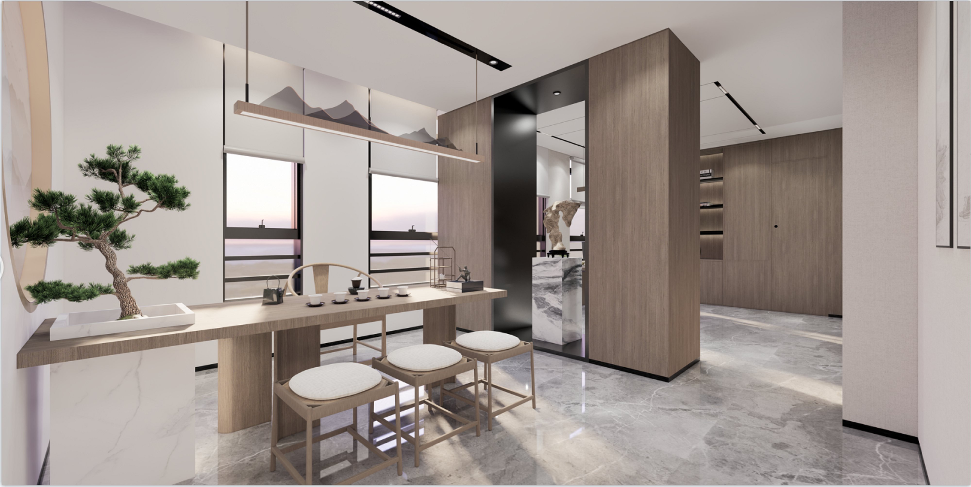 以现代的设计手法和材质进行升级呈现,入口处大理石形象墙,同木纹的前台区域营造出素雅的质感空间,在设计和规划上更关注场景营造和纵深感,赋予此区域更大的想象空间,既保持了沉稳、大气的理智感,又不使气氛过于肃静。大理石纹路的高颜值成就了空间的轻奢有度,实木的饱和质感刷新了工作的仪式感,一室容纳古今变化,有传承才能有创新。 整个前厅区域,用材质划分空间,把前台与其他空间区分开来。半高通透的风水盘伫立玄关一隅,仅设一窄桌一摆件,迎来送往,静默不语,又起着隐形隔断作用,呈现出一种通透感,创造出艺术且合理的多重渐变。 公共茶室,摒弃华丽的装饰,以书画和藏品展现业主的文化气质。 每一处视角都各有姿态,每一个断面都凸显出创意的氛围感。随处可见的现代感装饰艺术,不论哪个角度入镜,都颇有意趣。