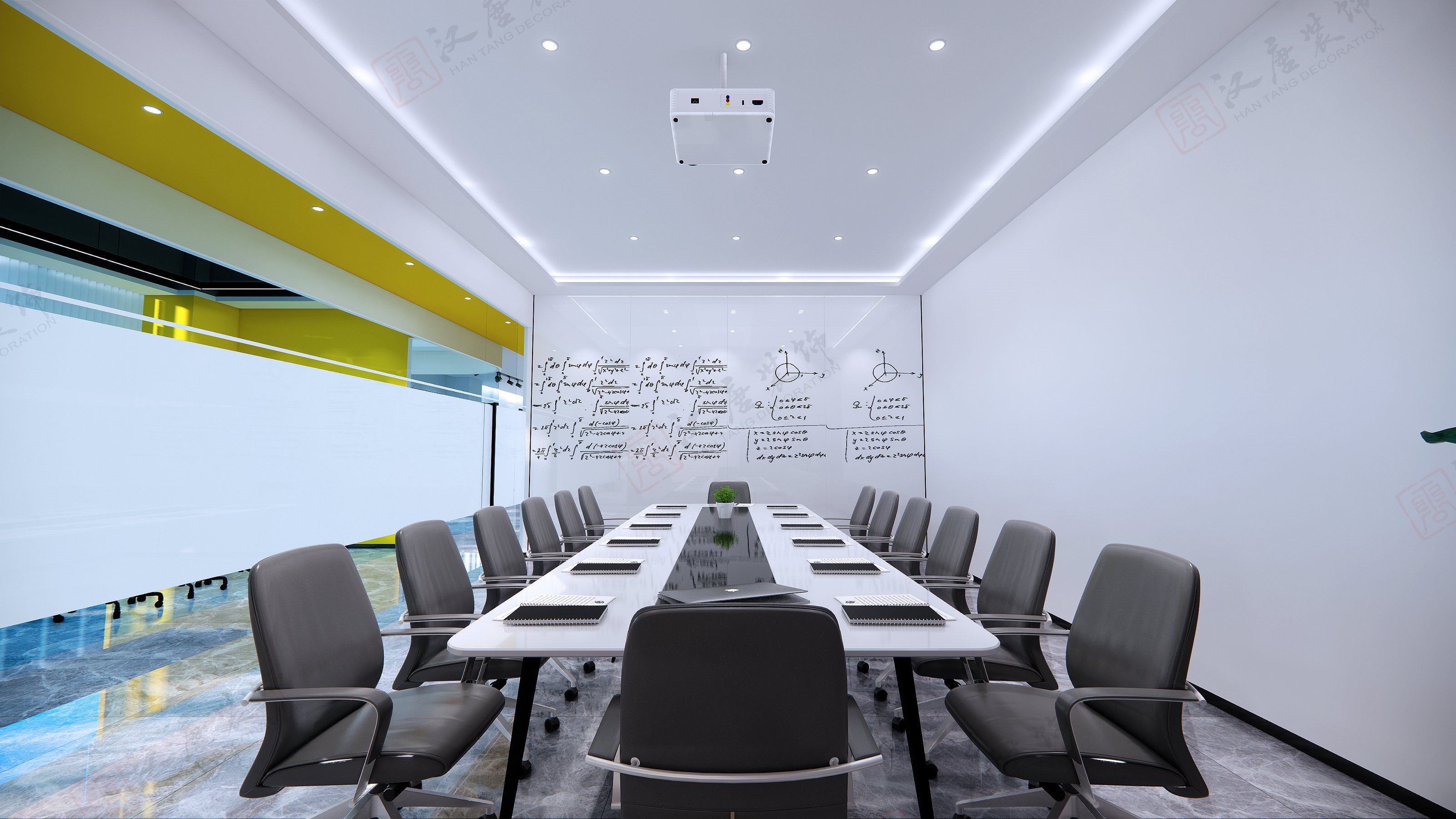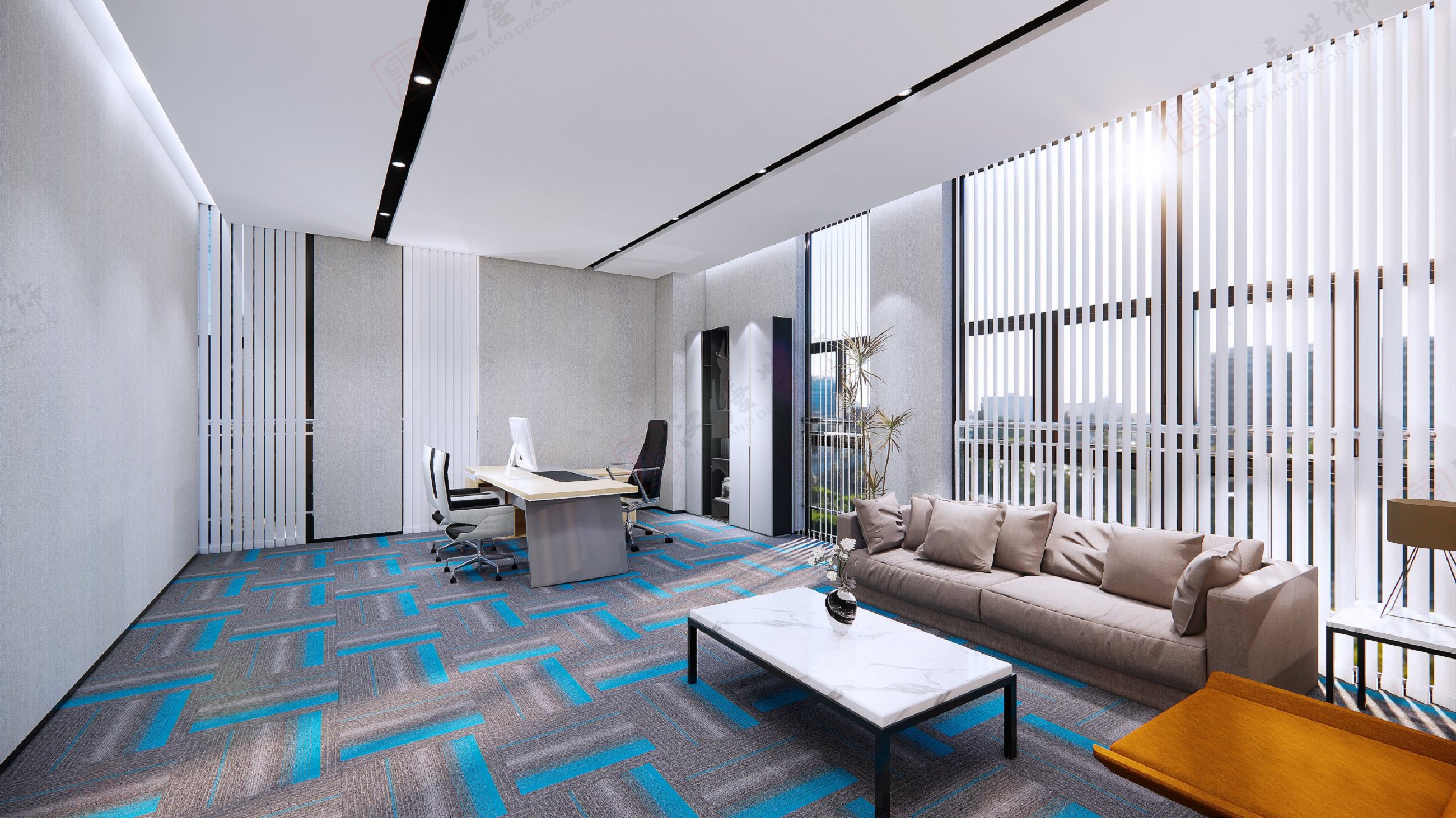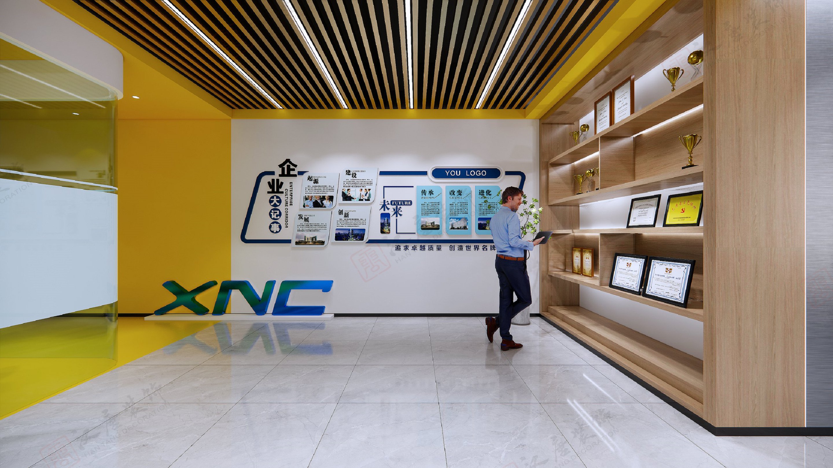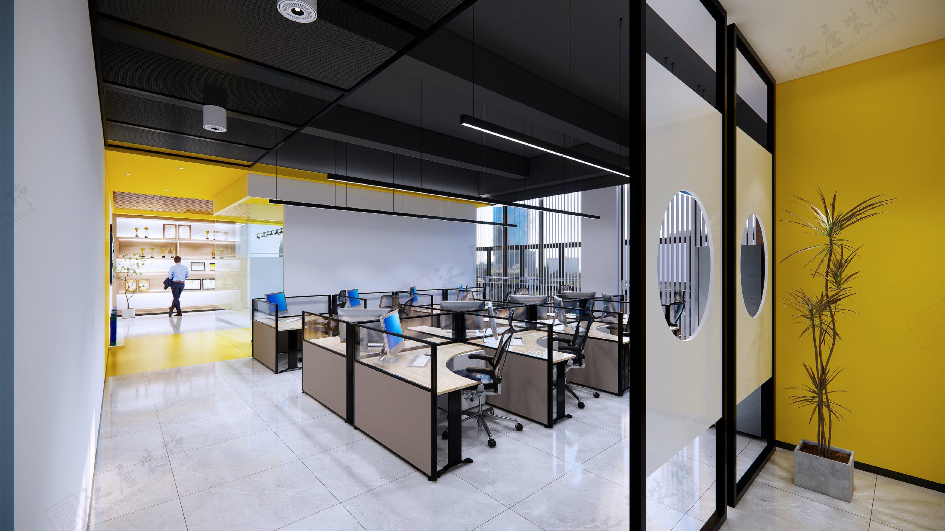 背景墙用金属拉丝护墙板,吊顶采用金属网,整体风格科技感比较强。 当人们进入空间后会产生怎样的情绪感知,往往是设计师探索与思考的核心。接待形象墙是最重要的识别记忆,所面对的群体,除了员工,更重要的是提升客户与供应链等人群的记忆点。 荣誉展厅去繁就简、点到为止,使装饰充满趣味。基于空间的比例与尺度以错位的隔板设计展示墙,横条灯带的设置,在墙体与灯光的映衬下十分醒目且质感十足。 与前厅色调相呼应,品牌展示区同样以白色铺底,金属饰面板点缀,吊顶采用裸顶喷深灰色,拉高视觉高点,加上艺术吊灯的点缀,使空间得到很好的延伸。 高效、舒适是作为办公空间设计所需要塑造的环境艺术,在温暖而舒适的环境中办公,并体验空间极致的艺术魅力,作为设计的本质追求。对空间进行分割组合,走过走廊,两侧都为办公区域,但空间开合有序,显现灵动。大量采用暖调破除办公冰冷的氛围,缔造温暖而舒适的办公环境,让员工在办公瞬间享受瞬间。 天花吊顶采用裸顶喷灰,让整体空间感更高,柱子采用仿真青苔绿植做装饰,局部通道用明黄色做点缀,让整体空间气氛活泼融洽,更具活力。 会议室秉承现代简约的设计宗旨,合理分区,沉静讲究,传达着清新的质感与内涵,这同样也是品牌调性的空间体现。 总经理室四周的视野开阔,为办公提供了一个舒适雅致的环境。大大增强人在空间无意识的情感互动,在与空间对话的瞬间便可激发灵感。