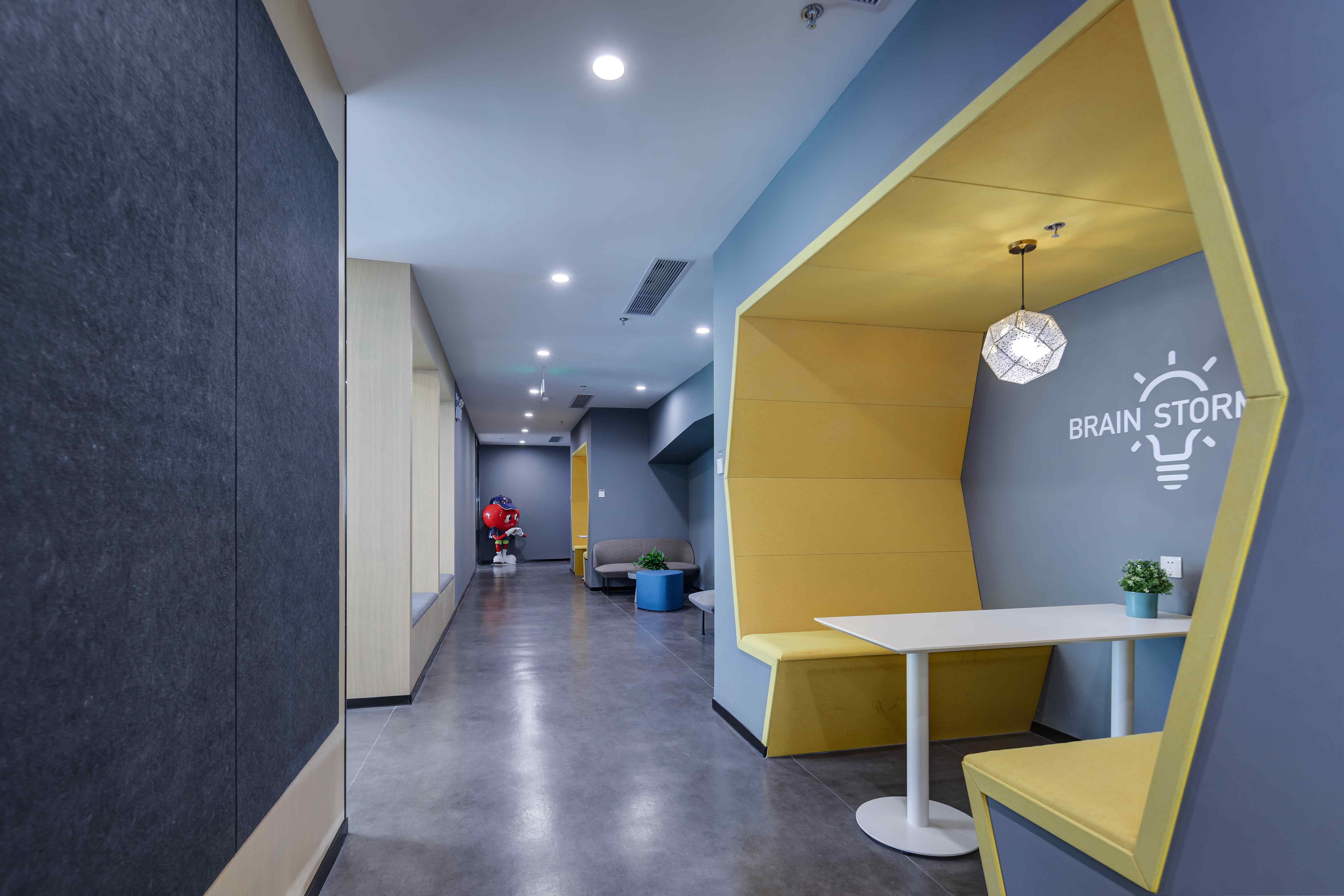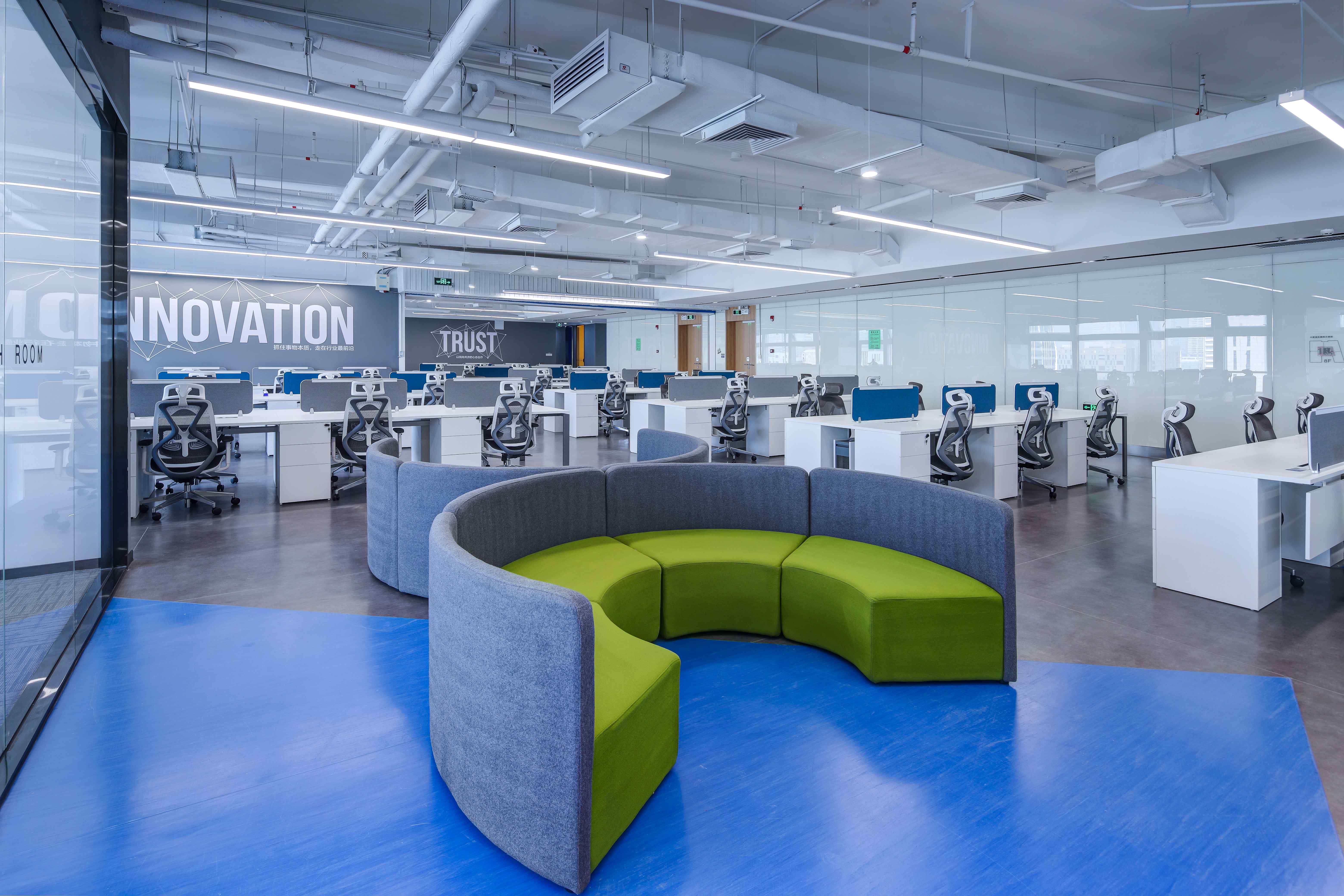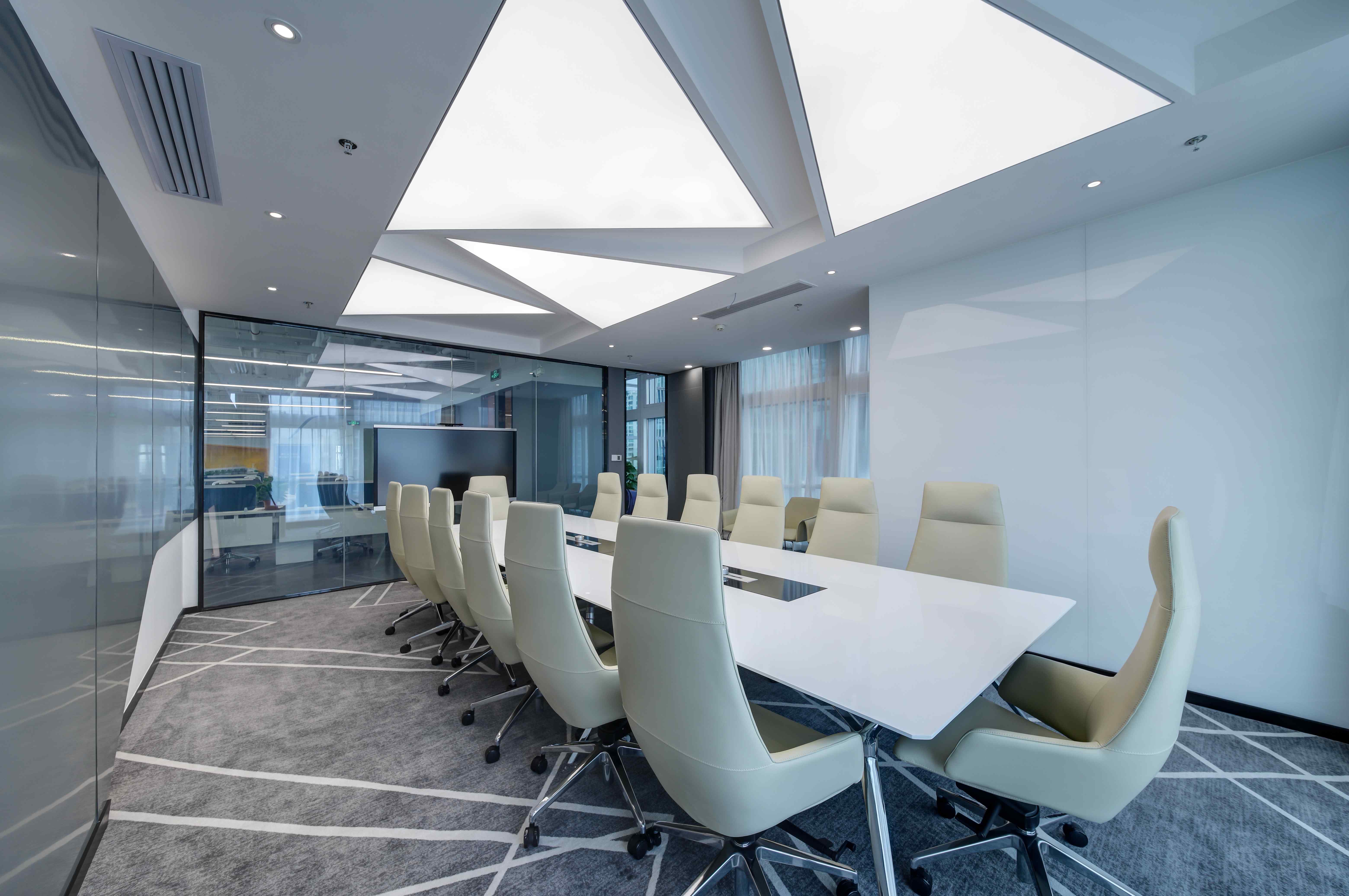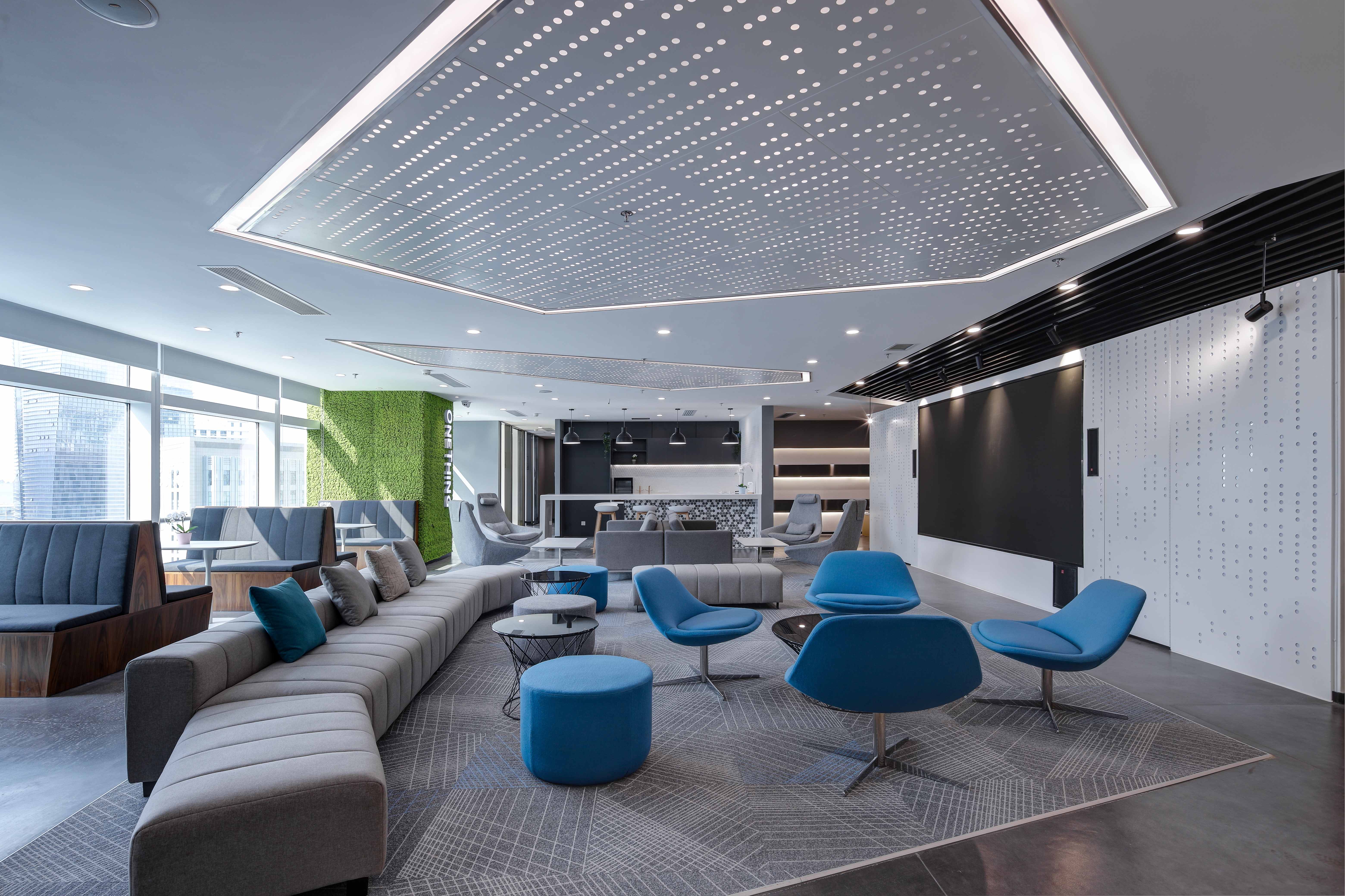 白灰色调中,一抹抹亮眼的科技蓝令意境升级。不妨一起沉浸其中,激荡灵感,畅想未来。同时,渐变元素带来了动感,巧妙地分割空间,加深了层次感。不同线性灯的布置,令空间依据功能分别呈现俏皮、庄严、休闲等不同特点。作为呼应元素的挂画是设计的诱导者,也引领着来访者的视觉动线。接待、办公、会议、休闲……多功能布局满足了办公的使用需求,让空间价值实现最大化。