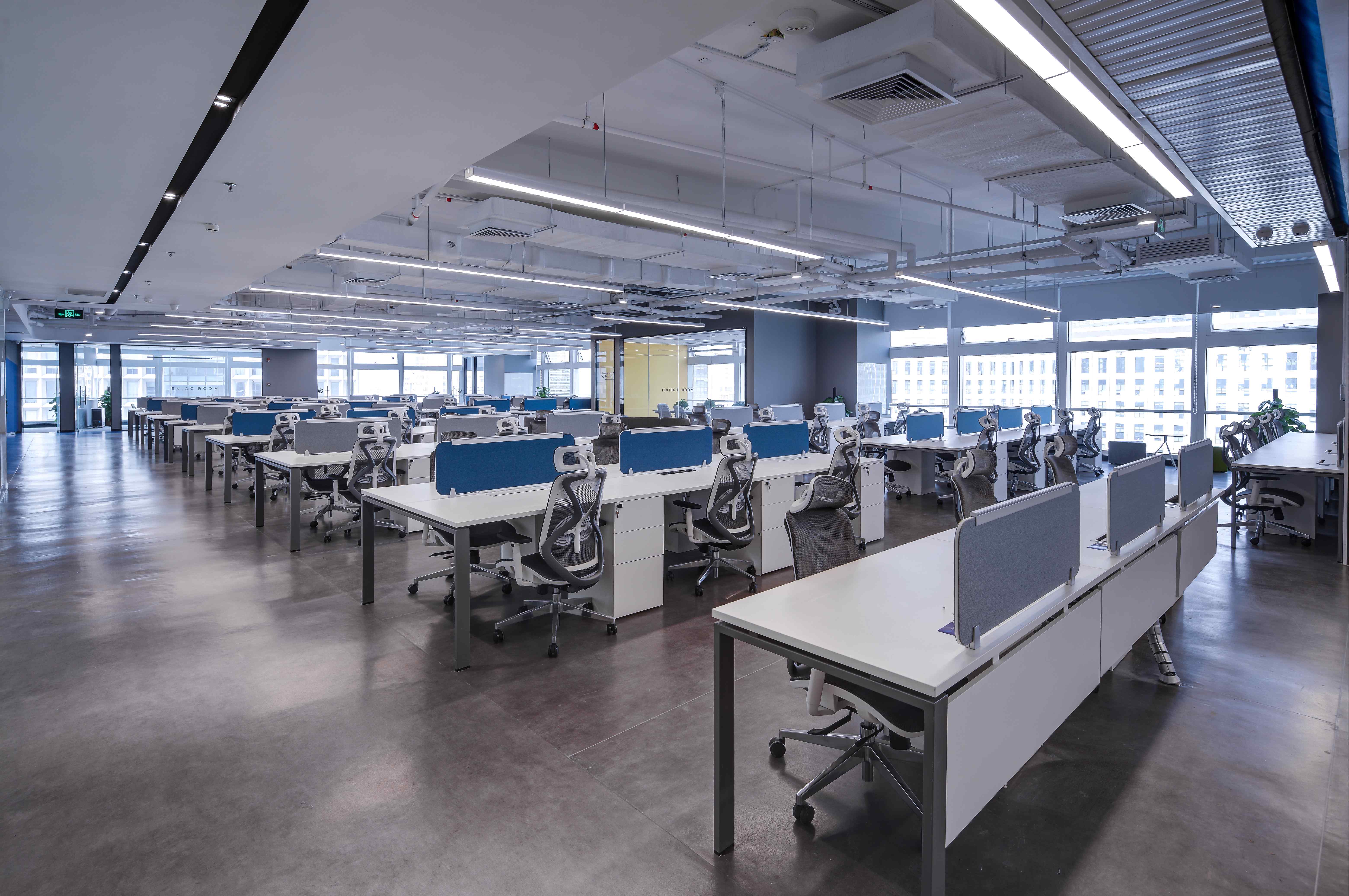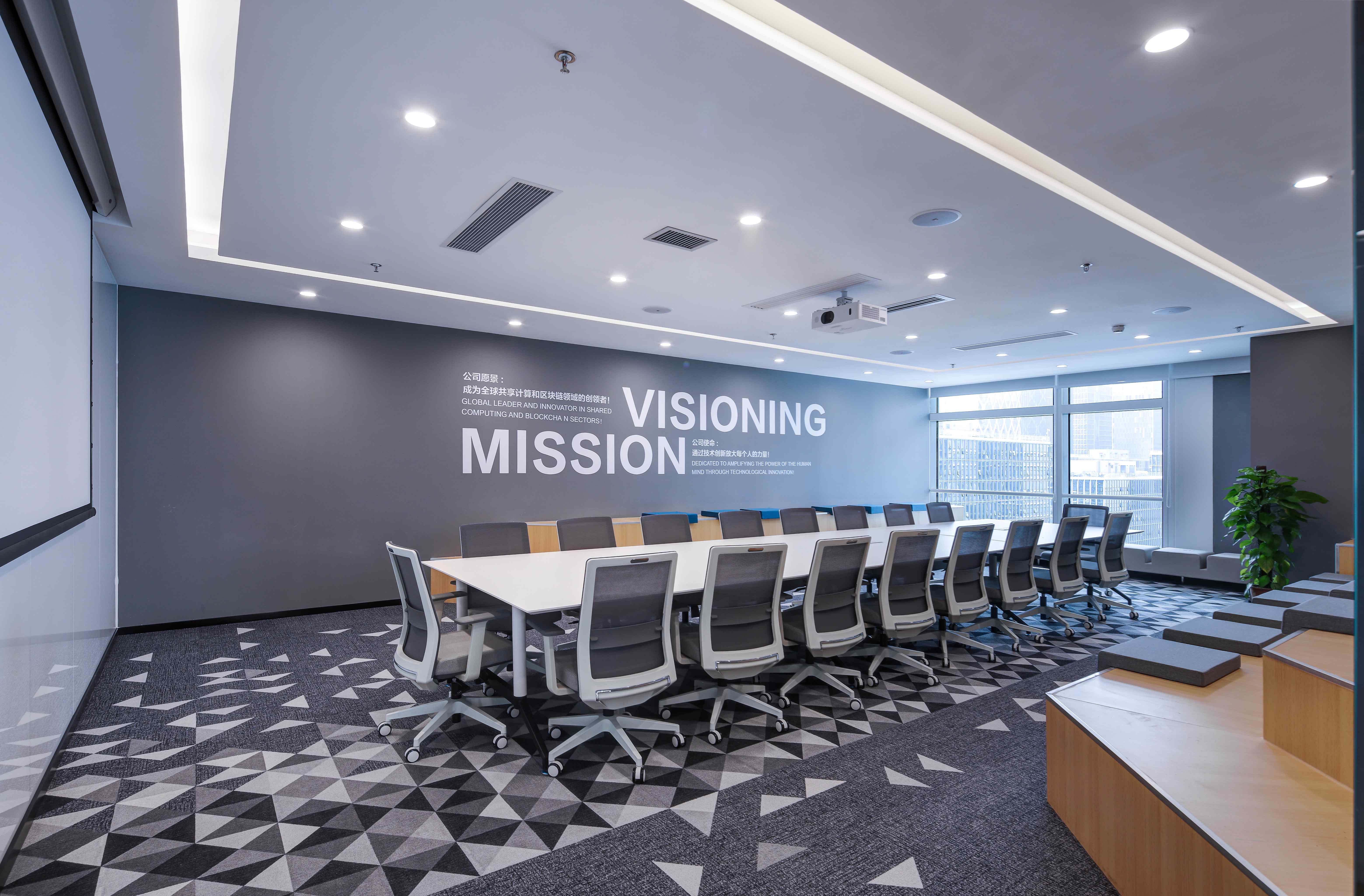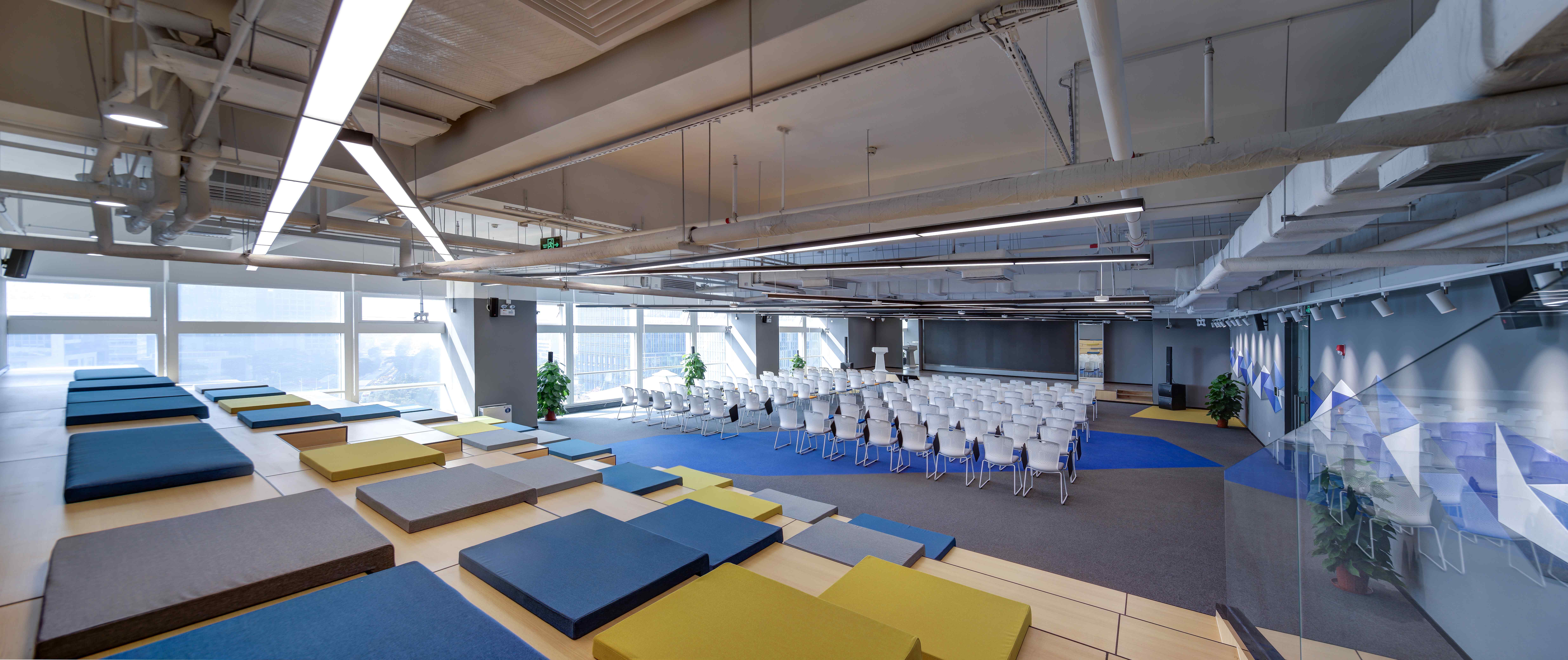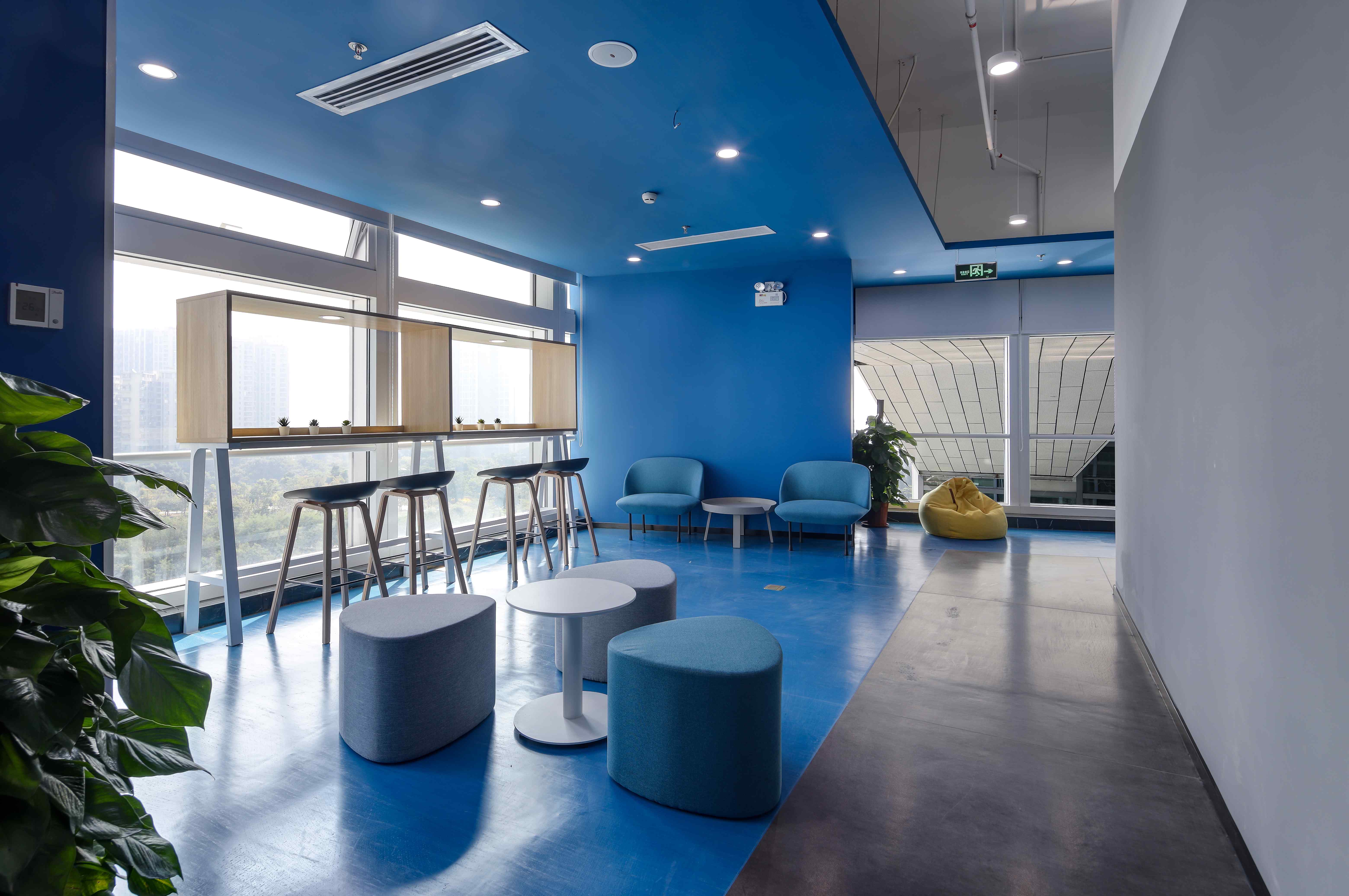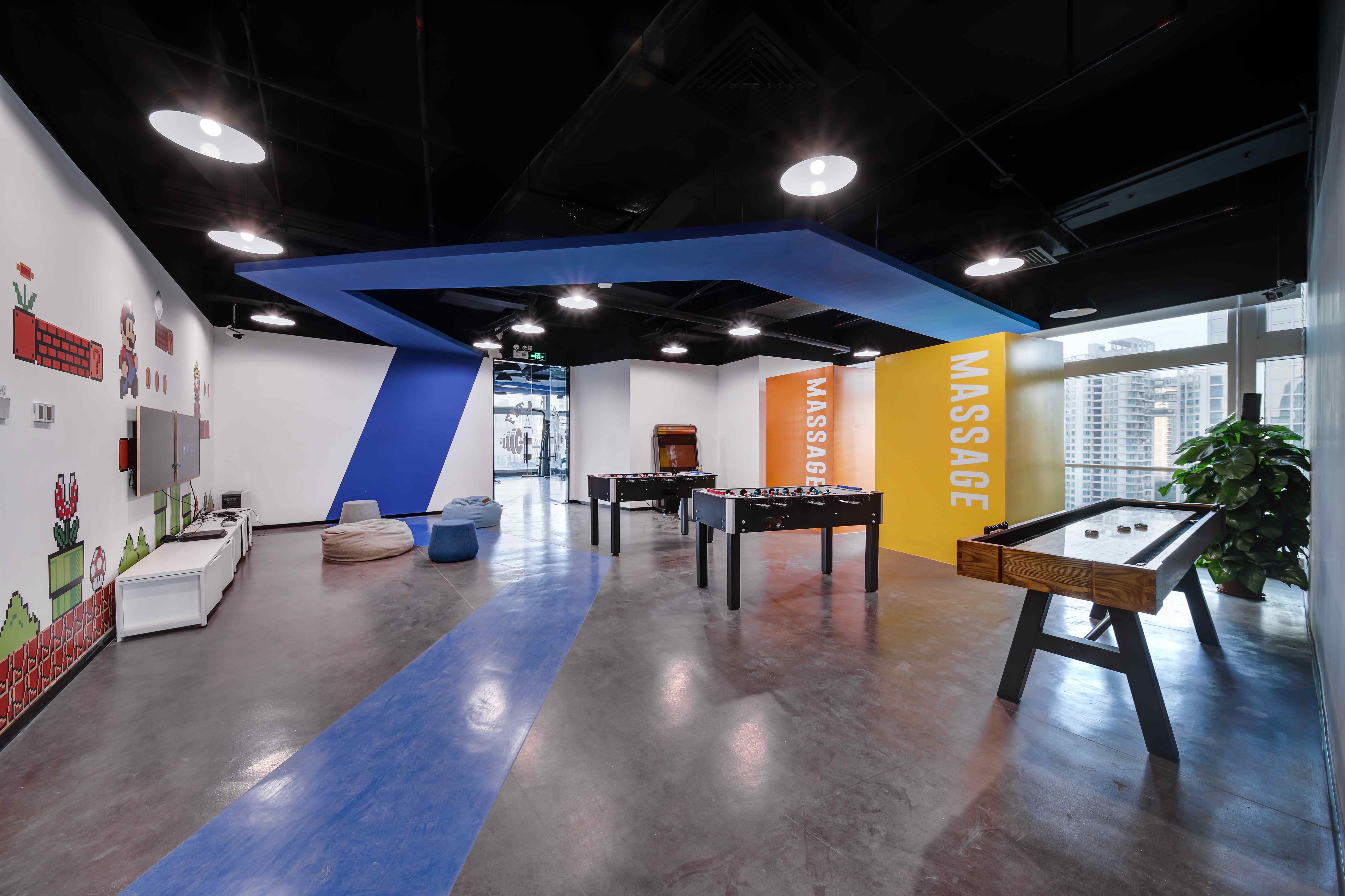 白灰色调中,一抹抹亮眼的科技蓝令意境升级。不妨一起沉浸其中,激荡灵感,畅想未来。同时,渐变元素带来了动感,巧妙地分割空间,加深了层次感。不同线性灯的布置,令空间依据功能分别呈现俏皮、庄严、休闲等不同特点。作为呼应元素的挂画是设计的诱导者,也引领着来访者的视觉动线。接待、办公、会议、休闲……多功能布局满足了办公的使用需求,让空间价值实现最大化。