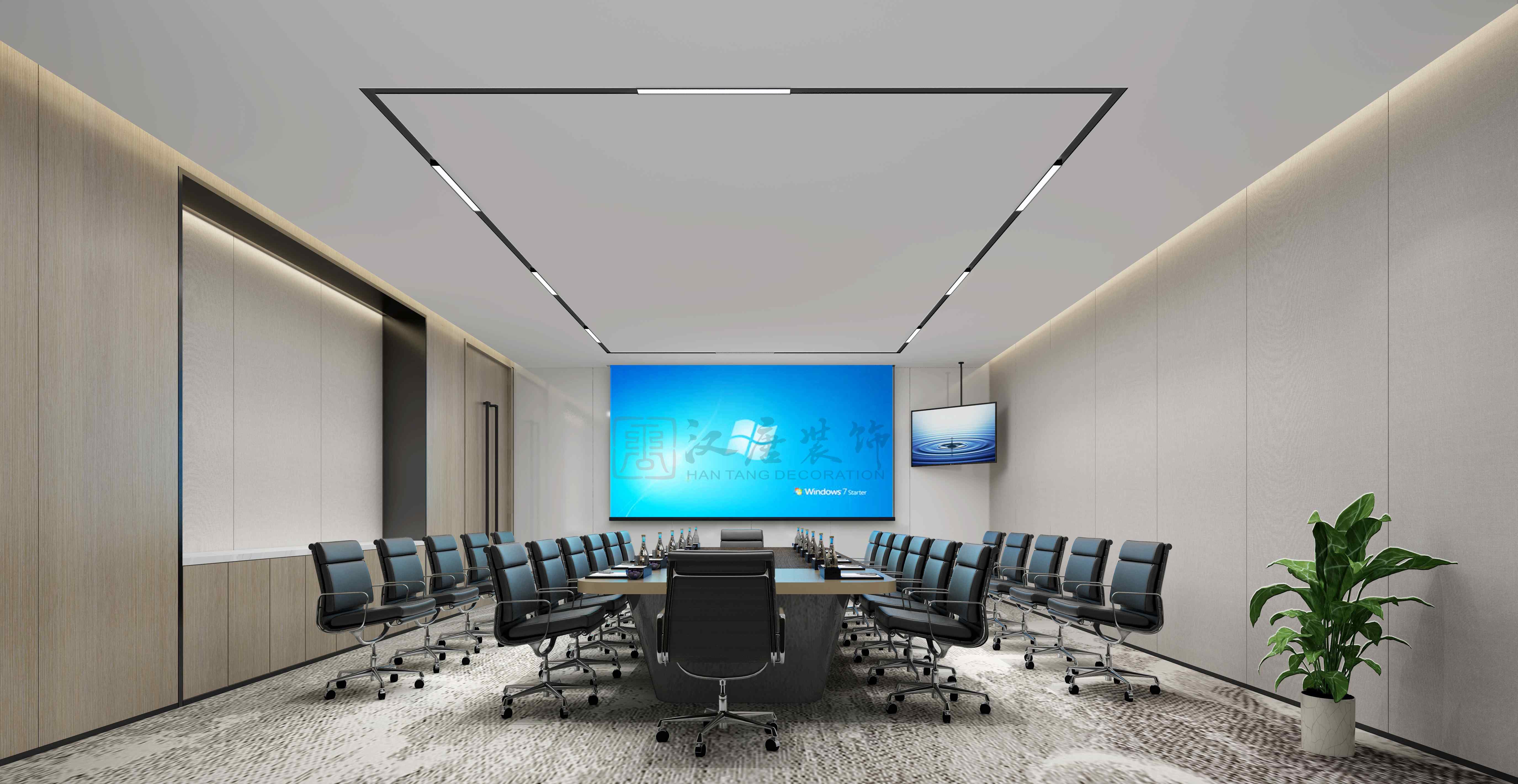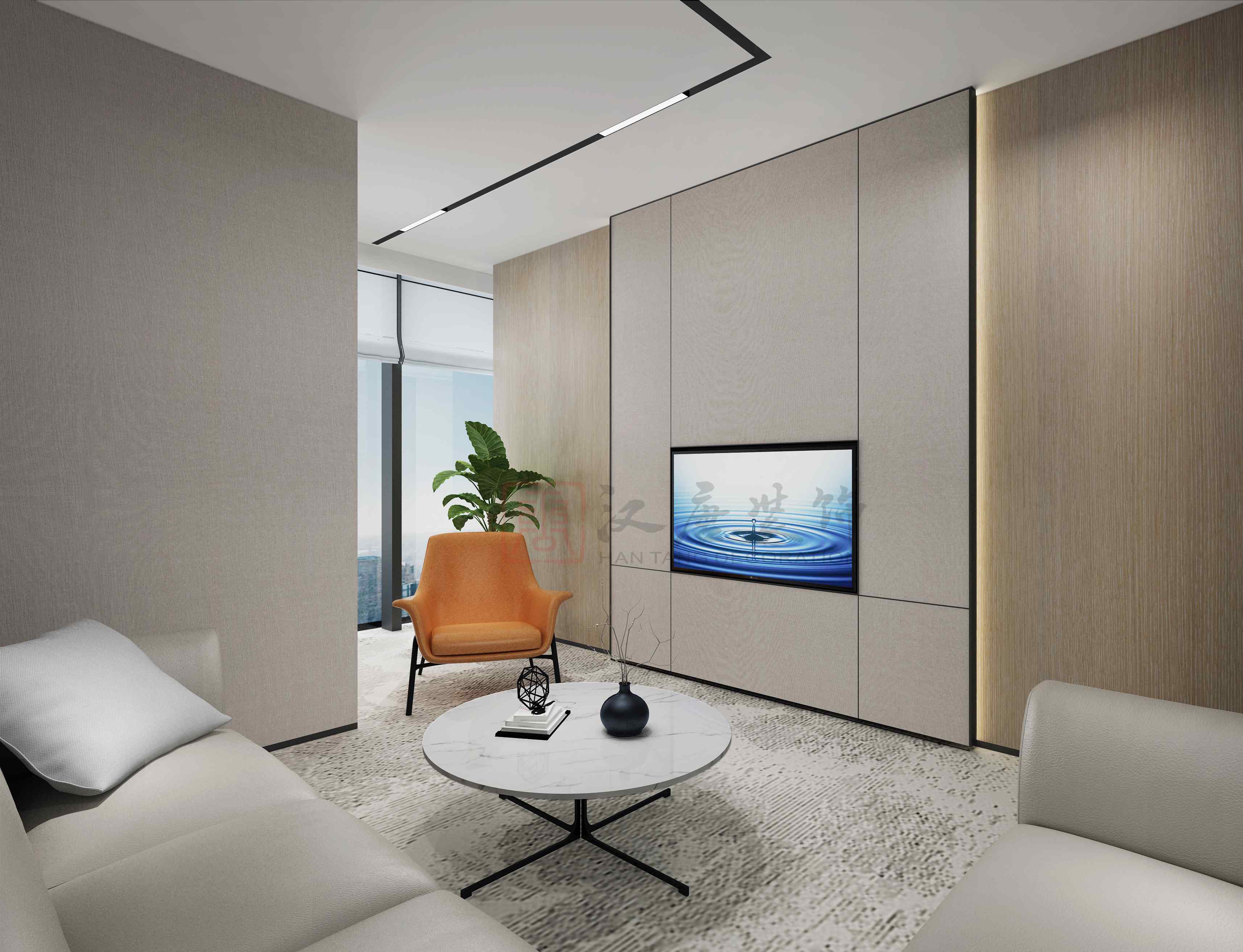设计说明:采用极简的现代手法,简单大气背景墙用雅士白大理石,结合浅色橡木饰面板,结合弘湾资本的企业调性,运用简洁、大气的风格对本项目进行设计,提倡高效办公,高效会议,设计上去繁从简的手法,让会议更高效。