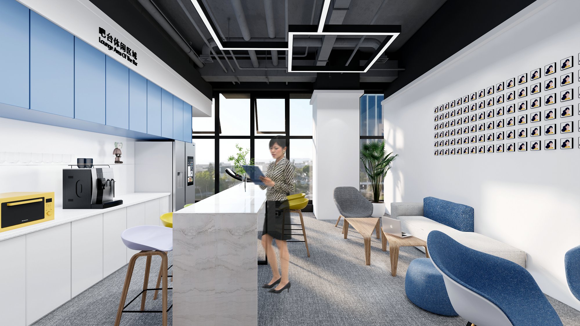 在茶水间设计了有水吧台、休闲书吧、健身功能、能让员工在工作之余有个多样式放松、休闲的地方。
