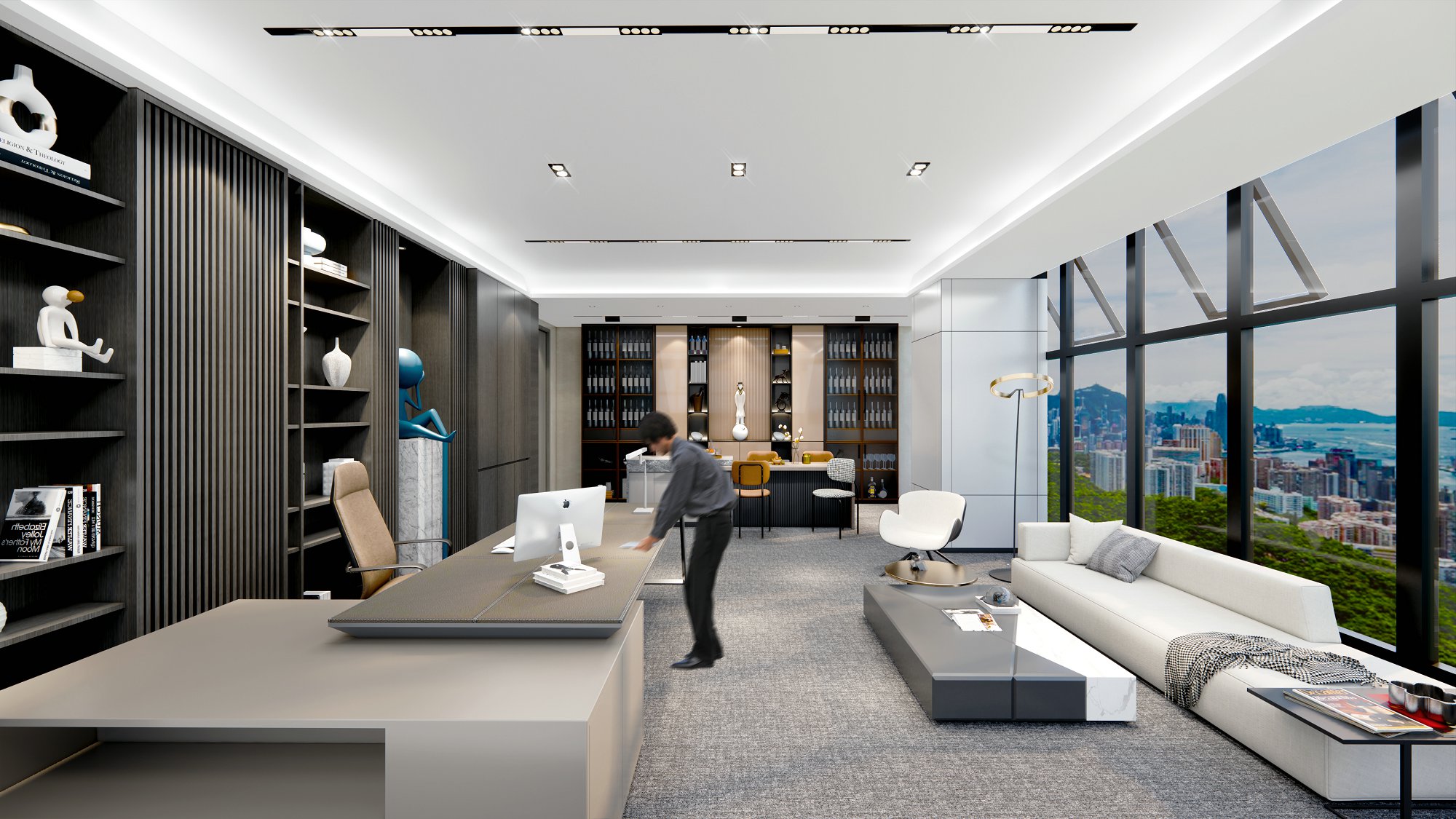我们了解到总经理是一位年轻有位的男士。常年在国外居住,习惯西式的生活方式。所以我们在设计的时候综合考量,在总经理办公室设计有展示酒柜、红酒吧台、西式简约的接待沙发、休闲单椅。在饰面材料的挑选上年轻化,做到既简约又有品质的空间。