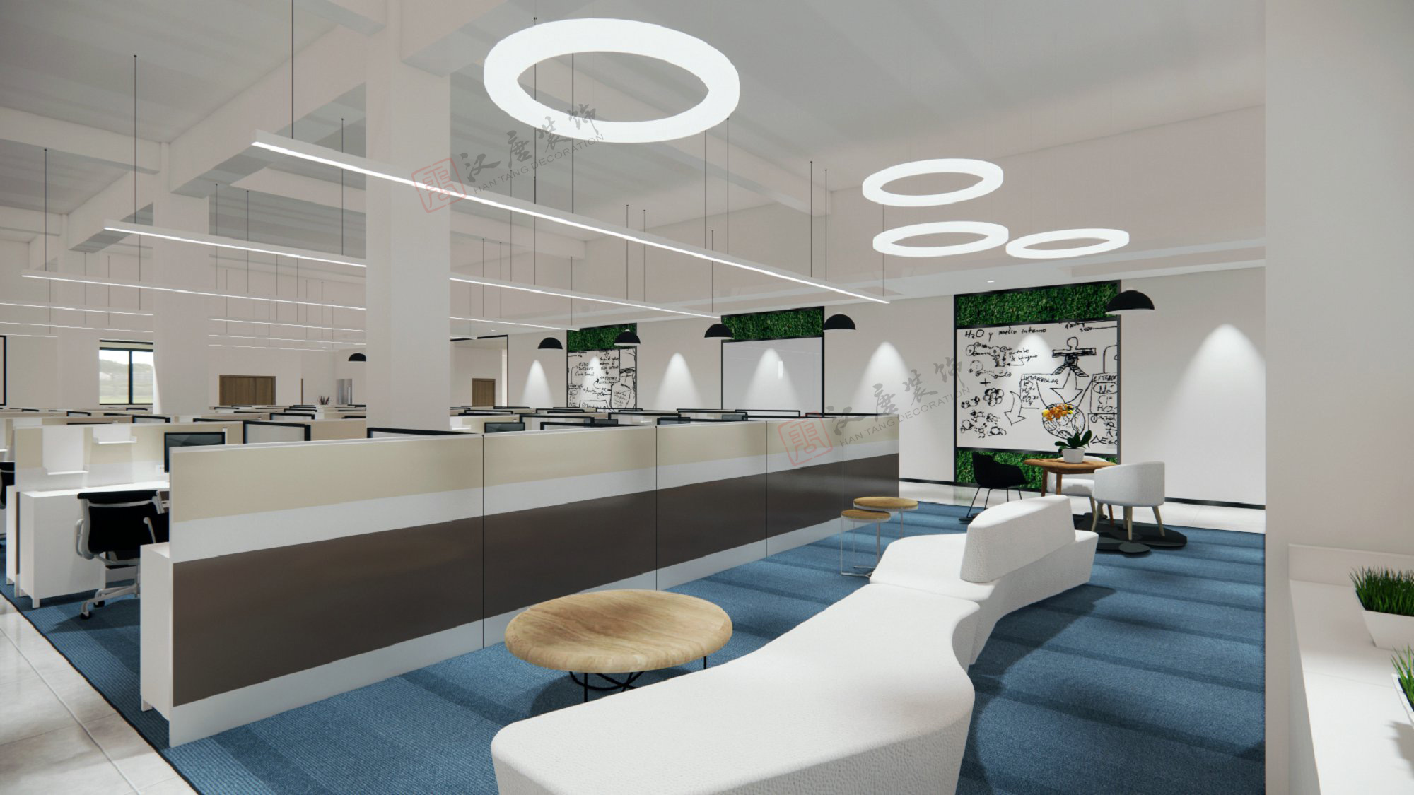 项目面积:园区总占地1万㎡,包含一栋写字楼,一栋厂房,一栋宿舍,食堂,绿化占地5000㎡,园林整体规划,外观升级设计说明:分析现有地形、地貌,工业生产线的特点,结合园区的功能、交通和人性化等方面,进行规划与设计,设计内容包含大堂设计,展厅设计,办公设计,厂房设计,宿舍设计,园林绿化设计,园区动线升级改造。“拓荒者”,勇于开拓、大胆创新、努力耕耘、不断前进。是垦拓的奋斗精神,能为这样优秀的企业打造有温度的产业办公社区环境,是我们的责任。 我们规划了“园中园”,用现代手法重塑园区中的人际关系与产业网络。以冷静沉稳的灰白色调为主,理性有序,体现企业安全可靠的行业特点。利用双首层的理念,以曲线元素设置了双层大堂,在两层通高的主中庭空间,引用幕墙玻璃引入阳光,带来光影丰富的变化,外挑的旋转楼梯成为整个空间的视觉焦点。由下至上起着连接接待与参观展厅的关系。而在员工办公区域则布置别具特色休闲吧互动交流空间模块。运用温暖木色,营造活跃明快的交流休闲的氛围。既满足理性高效的灵活开放的团队工作,又激发年轻员工自由奔放的畅想与交流。