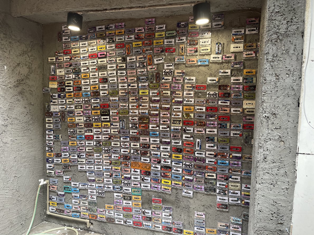 从门头开始,用水泥板做了一种破坏的造型,在那破坏的造型里面看着有些若隐若现的红砖,赋予了颜色的变化,大面积是玻璃,可以从外面看到里面,饰面是加了沙调了颜色之后抹上去的,看起来粗狂一些。在等候区做了一个内凹区域,那里贴了满满一墙的磁带,看磁带的歌曲名字还能勾起他人的回忆。那块位置是用来打卡的,也许还可以换其他形式,有更好的可以留言。