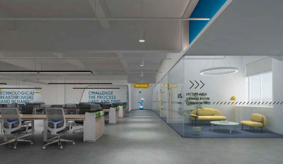通过丰富而多元的场景设置——正式和非正式空间的巧妙融合,结合丰富的几何语言,重新解构、重组现代办公空间,不仅满足客户的所有功能需求,也呈现出一个极具视觉冲击力和富于创意文化的协作型工作环境。